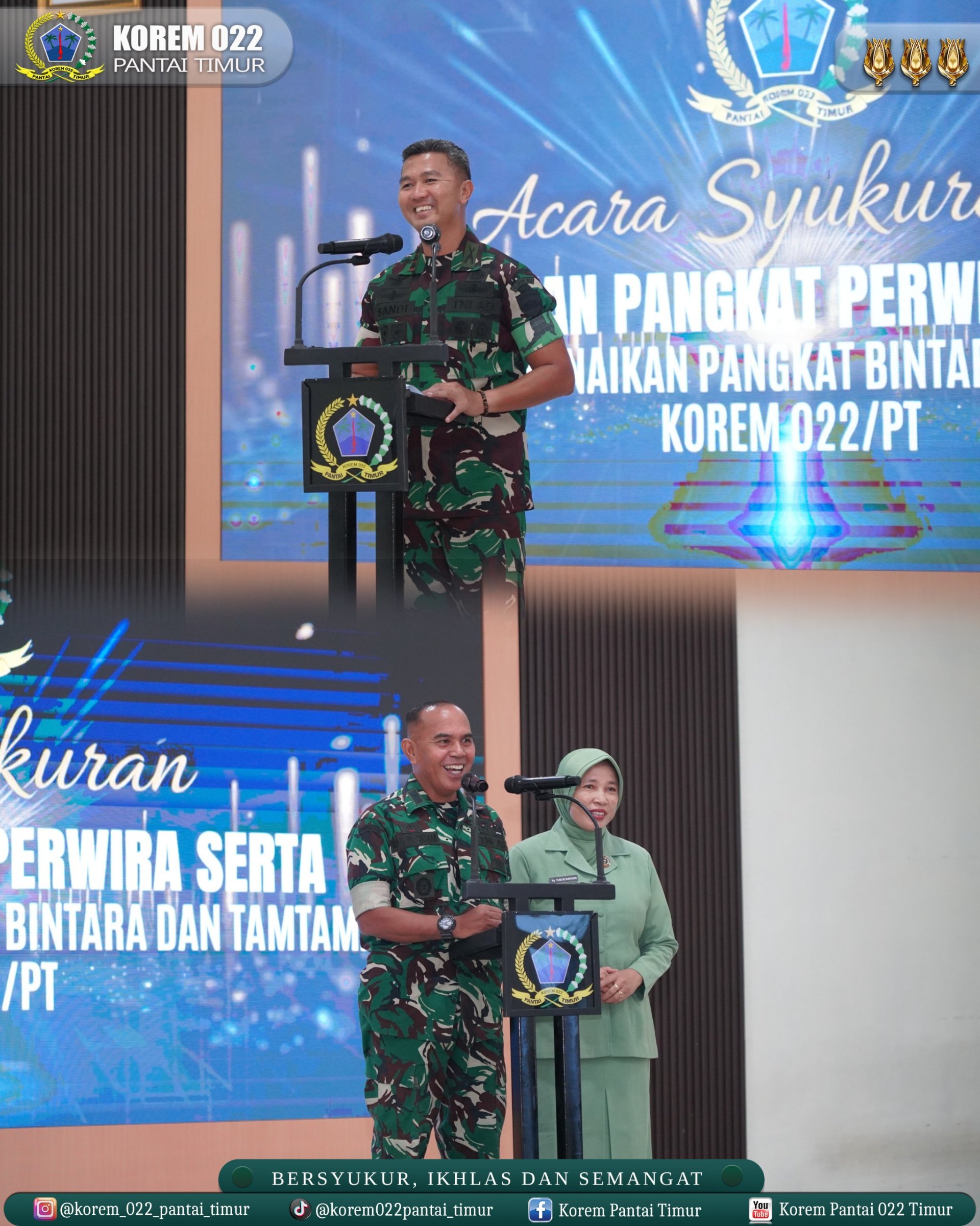 Dalam amanatnya Danrem 022/PT menyampaikan bahwa kenaikan pangkat merupakan kehormatan sekaligus amanah yang harus dipertanggungjawabkan dengan peningkatan kualitas kerja, kedisiplinan, dan profesionalisme. Pangkat baru yang disandang hendaknya menjadi pendorong semangat untuk terus memberikan pengabdian terbaik kepada Satuan, Masyarakat, Bangsa, dan Negara.