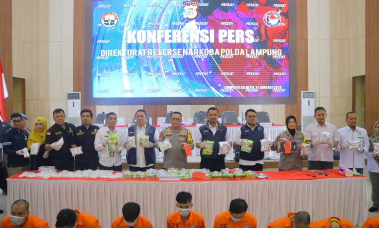 Lampung, IN – Direktorat Reserse Narkoba Polda Lampung menggelar Konferensi Pers Pengungkapan Kasus Tindak Pidana Narkotika Jenis Sabu sebanyak 38,19 Kilogram. Bertempat di Gedung Serba Guna (GSG) Presisi Polda Lampung. Rabu 31/1/24.