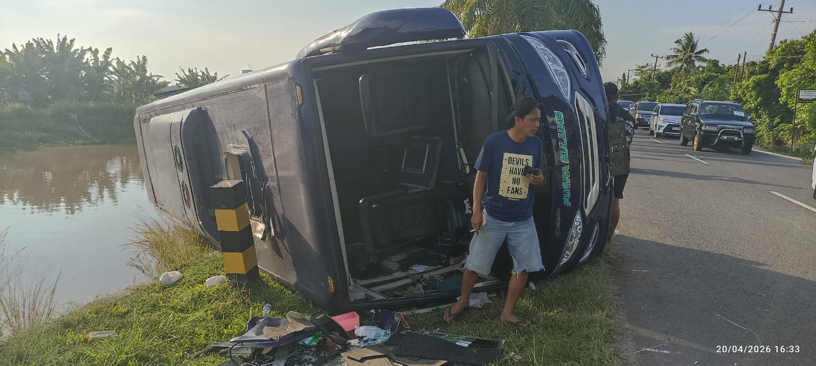 OKU Timur, IN – Naas sebuah Bus Pengantar haji yang bermuatan 30 orang dari Desa Pelita Jaya Kecamatan Buay Madang Raya terguling di depan sebuah dealer honda BK 8 pada hari Senin (20/04/2026) sekira pukul 15.30 wib.