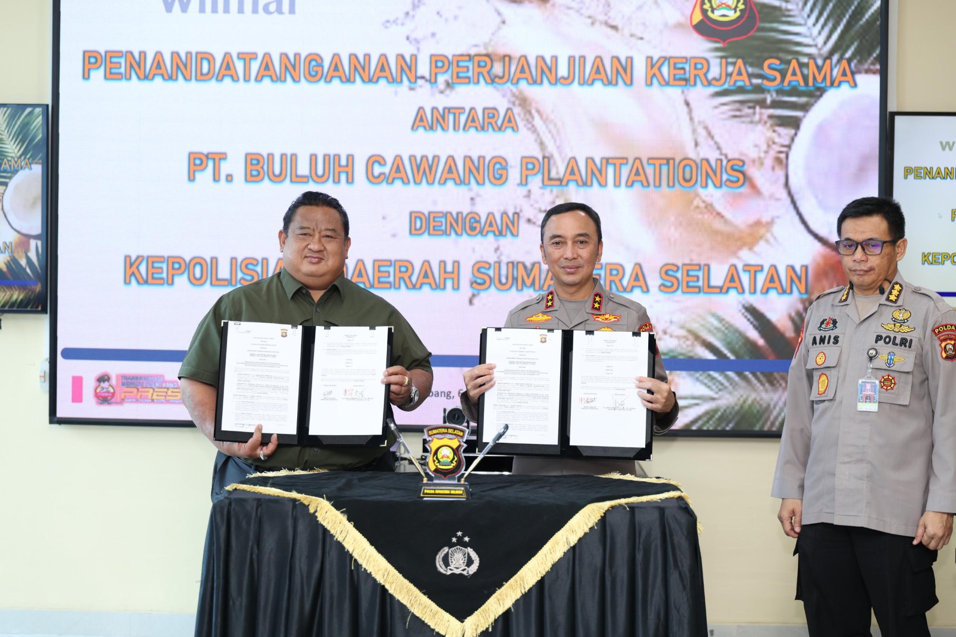 PALEMBANG, IN — Kapolda Sumatera Selatan Irjen Pol Dr. Sandi Nugroho, S.I.K., S.H., M.Hum. memimpin langsung penandatanganan perjanjian kerja sama antara Polda Sumsel dan PT Buluh Cawang Plantations, Kamis (6/3/2025) di Ruang Video Conference Gedung Presisi Polda Sumsel, Palembang.