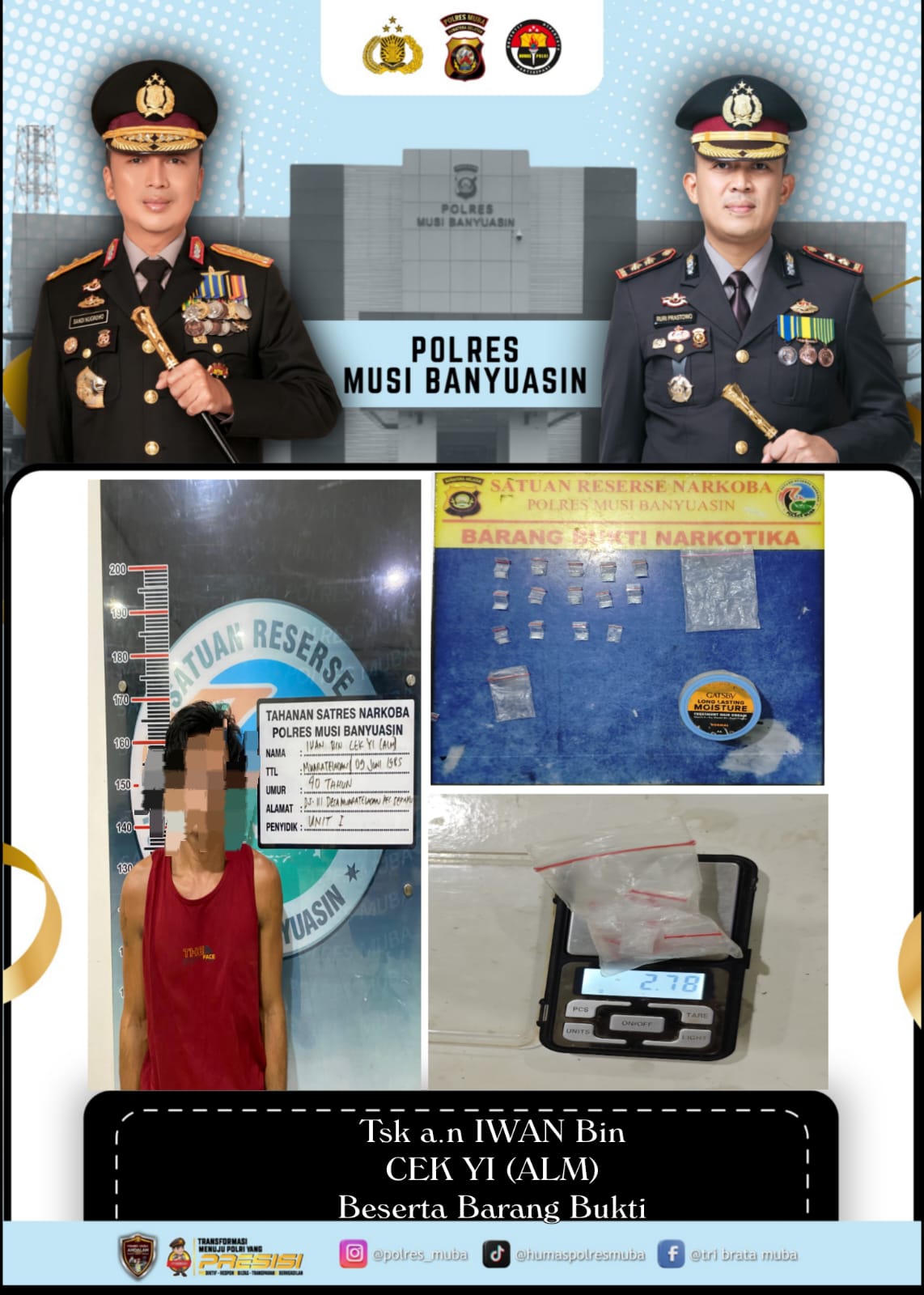 Petugas mengamankan tersangka berinisial I (40), seorang petani, yang ditangkap di depan rumahnya setelah dilakukan penyelidikan berdasarkan informasi masyarakat. Keberhasilan ini menjadi bagian dari pengungkapan beruntun yang dilakukan Satresnarkoba Polres MUBA dalam periode satu pekan.