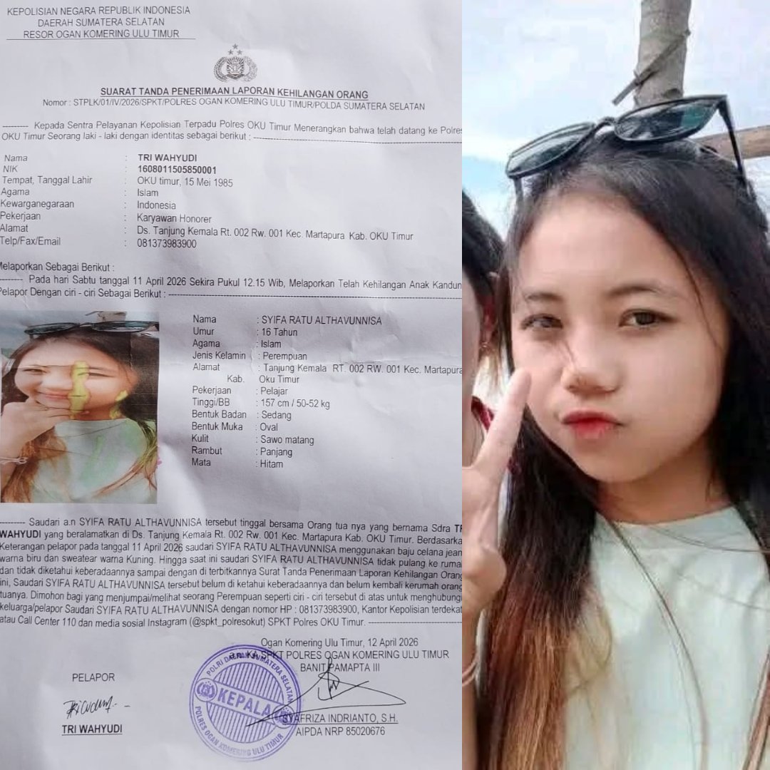 Berdasarkan laporan polisi Nomor STPLK/01/IV/2026/SPKT/Polres OKU Timur/Polda Sumsel yang telah terbit dan ditandatangani tersebut menyebutkan, telah hilang seorang anak dibawah umur, dengan ciri dan keterangan an. Syifa Ratu Althavunnisaumur, 16 tahun, agama islam, jenis kelamin perempuan, pelajar, alamat Desa Tanjung Kemala, tinggi 157, berat 50-52 Kg, bentuk badan sedang, bentuk muka oval, kulit sawo matang, rambut panjang, mata hitam.