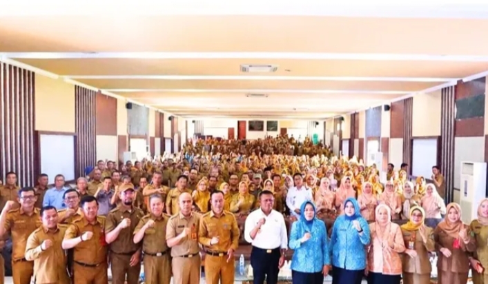 Prabumulih,IN –Bersama. Sekretaris Daerah H. Elman, S.T., M.M.,Wali Kota Prabumulih H. Arlan dan Ketua TP PKK Kota Prabumulih Hj. Linda Apriana Arlan, Staf Ahli TP PKK Ibu Nuning Mulya Franky, menghadiri Rapat Bulanan Pemerintah Kota Prabumulih yang berlangsung dengan penuh semangat kebersamaan. Rapat yang dipimpin oleh Asisten I Dr. Drs. Aris Priadi, S.H., M.Si ini turut dihadiri Asisten III Drs. Amilton, Staf Ahli Wali Kota, Kepala OPD, Camat, Lurah, Kepala Sekolah se-Kota Prabumulih, Kepala Desa, serta peserta rapat lainnya.6 April 2026