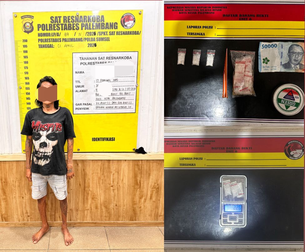 PALEMBANG, IN — Unit 6 Satuan Reserse Narkoba Polrestabes Palembang berhasil mengungkap kasus peredaran narkotika di kawasan Jalan R.A. Latif, Kelurahan 23 Ilir, Kecamatan Bukit Kecil, Kota Palembang, Selasa (31/3/2026) sekira pukul 19.00 WIB.