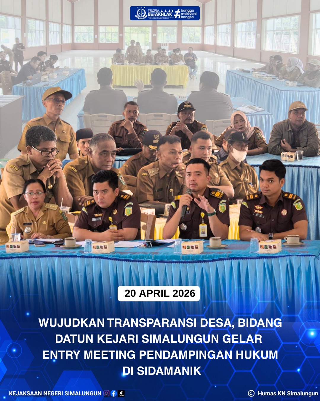 SIDAMANIK, IN – Dalam komitmen memperkuat tata kelola keuangan negara di tingkat paling dasar, Kejaksaan Negeri Simalungun melalui Bidang Perdata dan Tata Usaha Negara (Datun) resmi memulai rangkaian pendampingan hukum bagi desa-desa di wilayah Kabupaten Simalungun. Agenda ini diawali dengan pelaksanaan Entry Meeting Pendampingan Hukum (Legal Assistance) Pengelolaan Anggaran Dana Desa yang bertempat di Aula Kantor Camat Sidamanik, Senin (20/4).